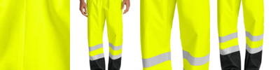 When the weather turns, pull on these water-resistant pants and continue working safely. 100% polyester oxford with water-resistant finish Black bottom lower legs for a cleaner appearance Durable, reflective 2-inch tape provides 360-degree visibility on legs Fully seam sealed Elastic waistband with drawcord Adjustable snap leg openings